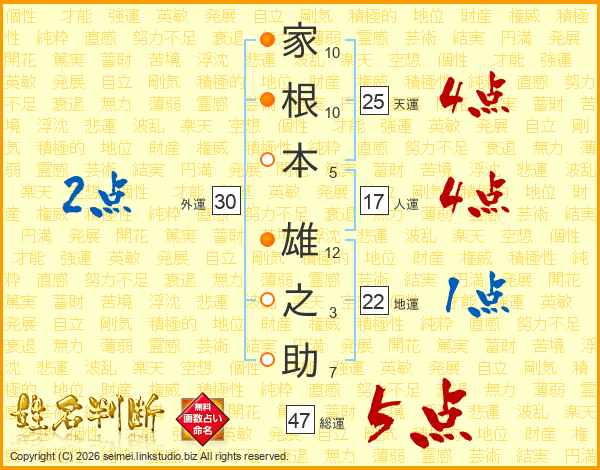 家(10画)根(10画)本(5画) 雄(12画)之(3画)助(7画)
