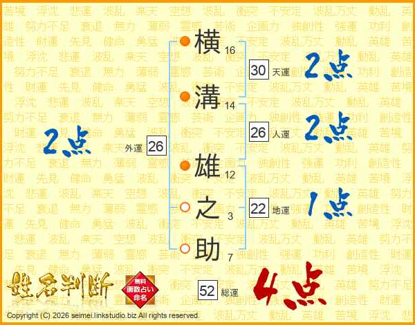 横(16画)溝(14画) 雄(12画)之(3画)助(7画)