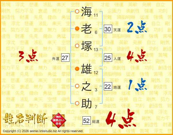 海(11画)老(6画)塚(13画) 雄(12画)之(3画)助(7画)