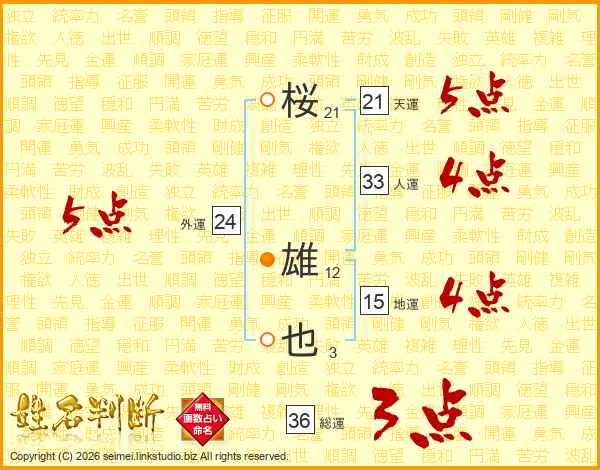 桜(21画) 雄(12画)也(3画)