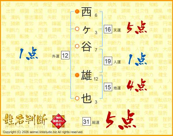 西(6画)ヶ(3画)谷(7画) 雄(12画)也(3画)