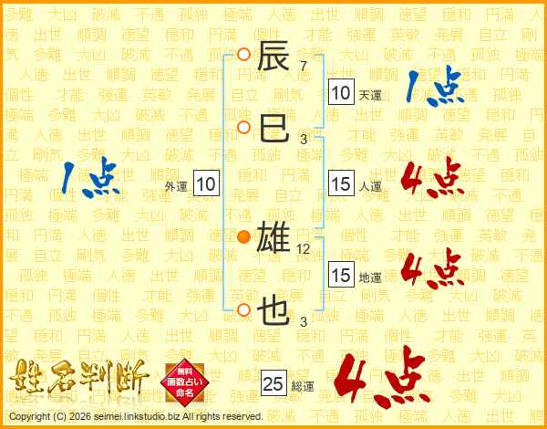 辰巳雄也さんの総運は25画の4点!
