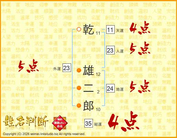 乾(11画) 雄(12画)二(2画)郎(10画)