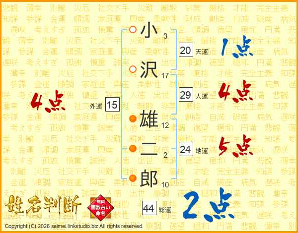 小(3画)沢(17画) 雄(12画)二(2画)郎(10画)