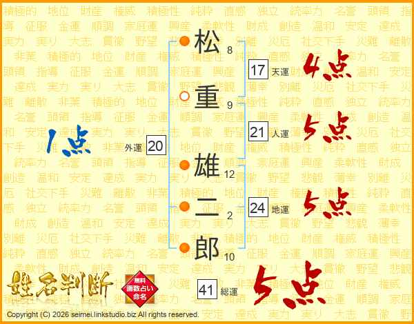 松(8画)重(9画) 雄(12画)二(2画)郎(10画)