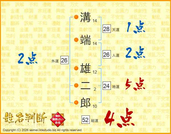 溝(14画)端(14画) 雄(12画)二(2画)郎(10画)
