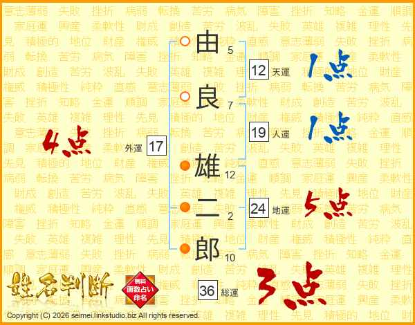 由良雄二郎さんの総運は36画の3点!