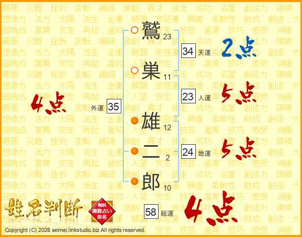 鷲(23画)巣(11画) 雄(12画)二(2画)郎(10画)