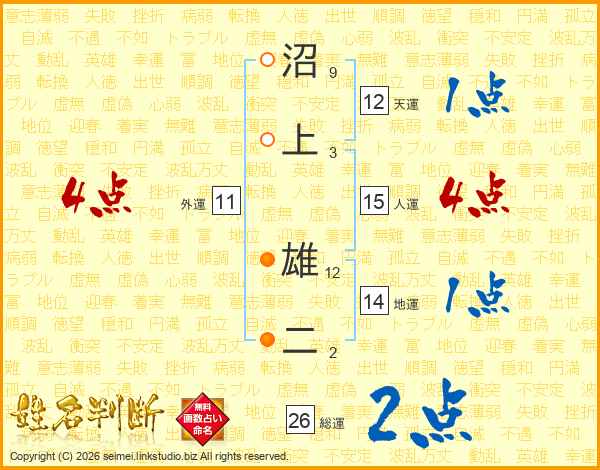 生活面を象徴する運勢です。外部から受ける影響力を表し、結婚運、家庭運や職場、環境への順応性を表します。総運から人運を引いた画数。姓や名が1文字の場合を除く。