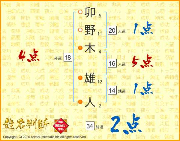 卯(5画)野(11画)木(4画) 雄(12画)人(2画)