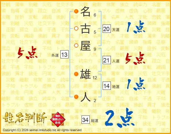 名(6画)古(5画)屋(9画) 雄(12画)人(2画)