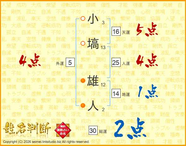 あなたの人生を表す1番重要な運勢です。生涯を通じて影響する総合運となり、主に50歳以降の晩年期に影響を及ぼします。苗字と名前の合計画数。