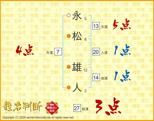 生活面を象徴する運勢です。外部から受ける影響力を表し、結婚運、家庭運や職場、環境への順応性を表します。総運から人運を引いた画数。姓や名が1文字の場合を除く。