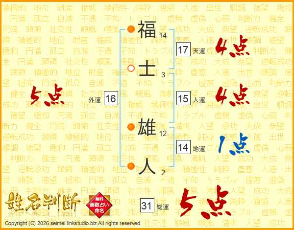 生活面を象徴する運勢です。外部から受ける影響力を表し、結婚運、家庭運や職場、環境への順応性を表します。総運から人運を引いた画数。姓や名が1文字の場合を除く。