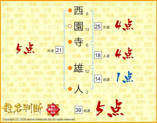 西(6画)園(13画)寺(6画) 雄(12画)人(2画)