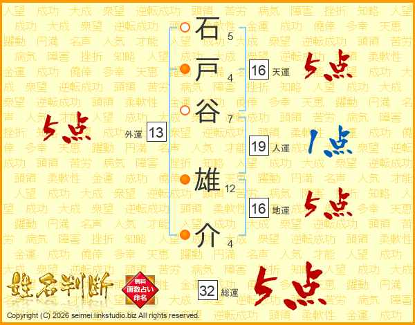 石(5画)戸(4画)谷(7画) 雄(12画)介(4画)
