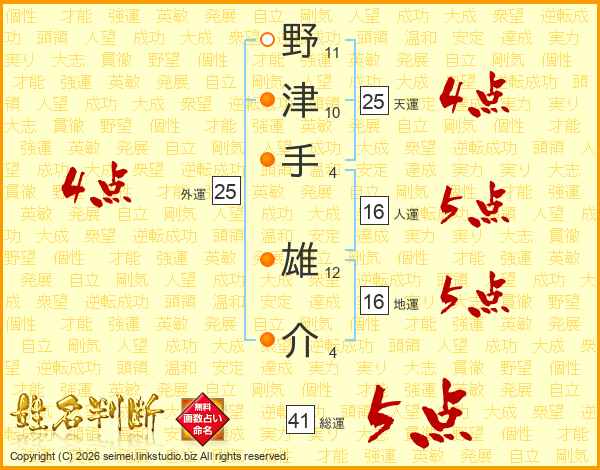 野(11画)津(10画)手(4画) 雄(12画)介(4画)