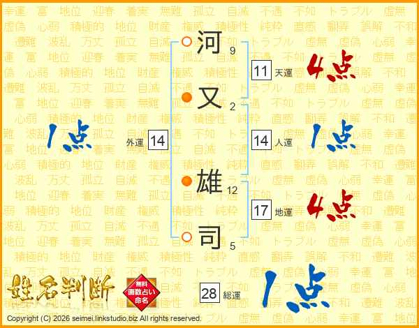 生活面を象徴する運勢です。外部から受ける影響力を表し、結婚運、家庭運や職場、環境への順応性を表します。総運から人運を引いた画数。姓や名が1文字の場合を除く。