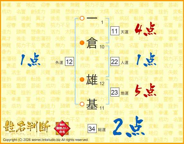あなたの人生を表す1番重要な運勢です。生涯を通じて影響する総合運となり、主に50歳以降の晩年期に影響を及ぼします。苗字と名前の合計画数。