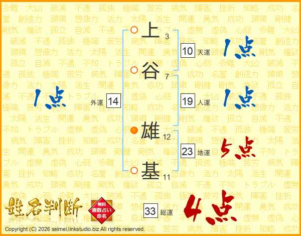 生活面を象徴する運勢です。外部から受ける影響力を表し、結婚運、家庭運や職場、環境への順応性を表します。総運から人運を引いた画数。姓や名が1文字の場合を除く。