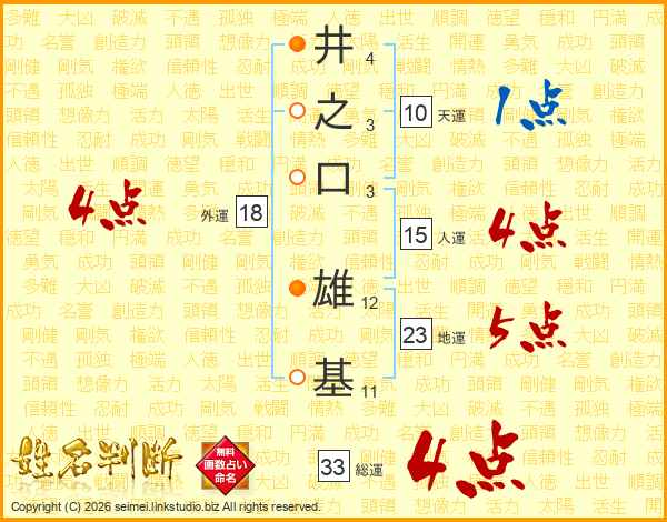 井(4画)之(3画)口(3画) 雄(12画)基(11画)