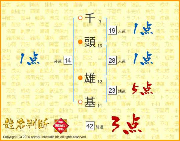 あなたの人生を表す1番重要な運勢です。生涯を通じて影響する総合運となり、主に50歳以降の晩年期に影響を及ぼします。苗字と名前の合計画数。