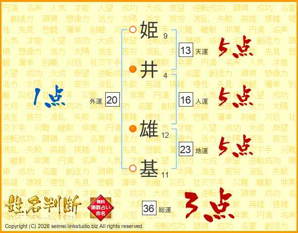 姫(9画)井(4画) 雄(12画)基(11画)