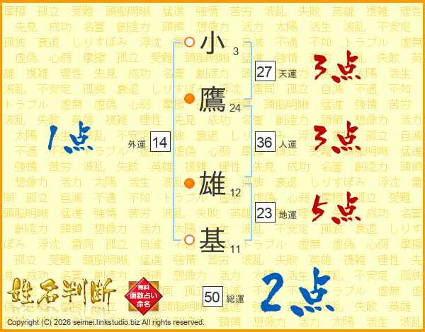 小(3画)鷹(24画) 雄(12画)基(11画)