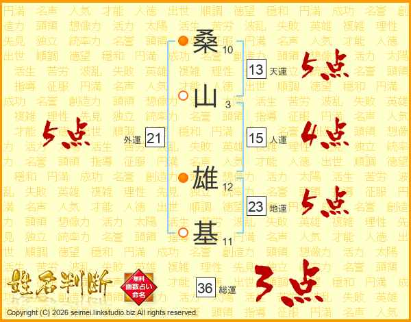 あなたの人生を表す1番重要な運勢です。生涯を通じて影響する総合運となり、主に50歳以降の晩年期に影響を及ぼします。苗字と名前の合計画数。