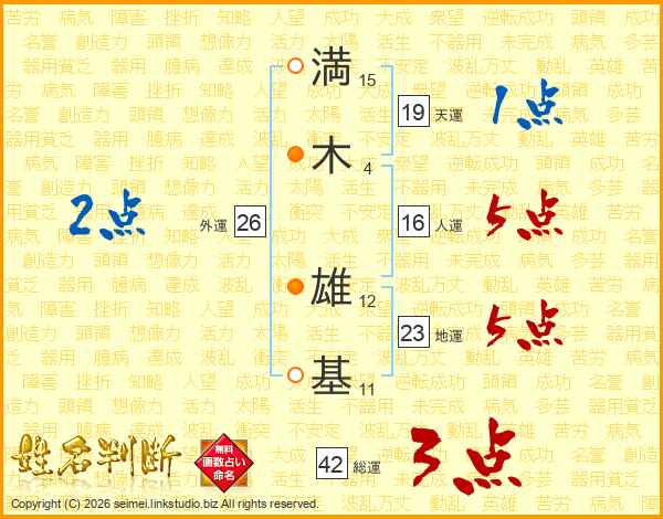 満(15画)木(4画) 雄(12画)基(11画)