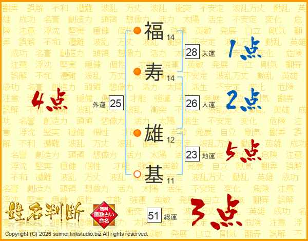 あなたの人生を表す1番重要な運勢です。生涯を通じて影響する総合運となり、主に50歳以降の晩年期に影響を及ぼします。苗字と名前の合計画数。