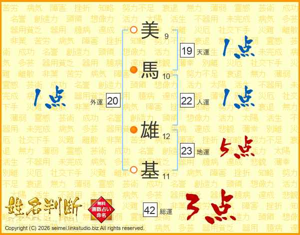 美(9画)馬(10画) 雄(12画)基(11画)