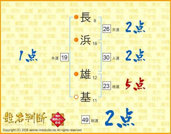 長(8画)浜(18画) 雄(12画)基(11画)