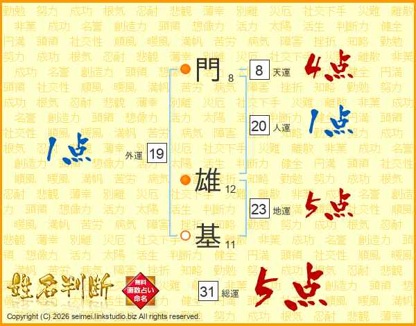 あなたの人生を表す1番重要な運勢です。生涯を通じて影響する総合運となり、主に50歳以降の晩年期に影響を及ぼします。苗字と名前の合計画数。