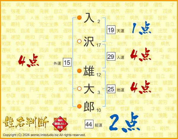 入(2画)沢(17画) 雄(12画)大(3画)郎(10画)