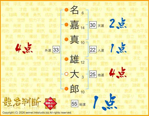 名(6画)嘉(14画)真(10画) 雄(12画)大(3画)郎(10画)