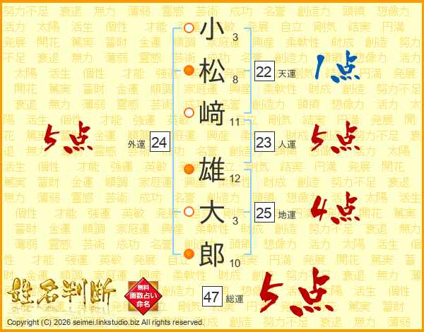 小(3画)松(8画)﨑(11画) 雄(12画)大(3画)郎(10画)
