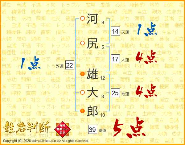 河(9画)尻(5画) 雄(12画)大(3画)郎(10画)