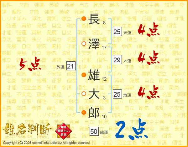 長澤雄大郎さんの人運は29画の4点!