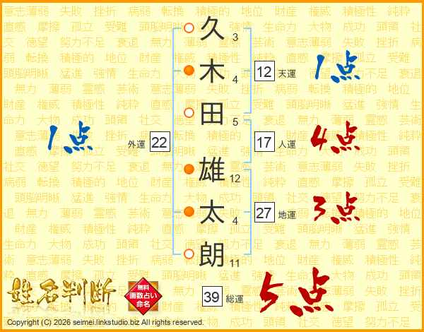 久(3画)木(4画)田(5画) 雄(12画)太(4画)朗(11画)
