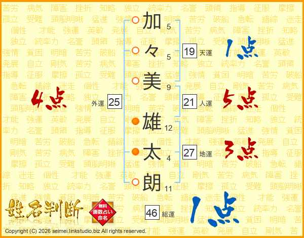 加(5画)々(5画)美(9画) 雄(12画)太(4画)朗(11画)