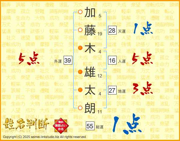 加(5画)藤(19画)木(4画) 雄(12画)太(4画)朗(11画)