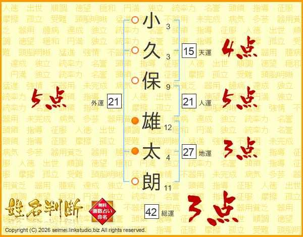 小(3画)久(3画)保(9画) 雄(12画)太(4画)朗(11画)