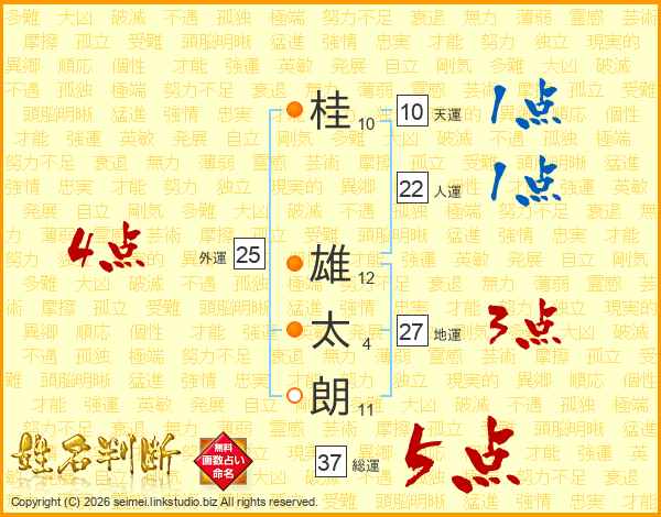 桂(10画) 雄(12画)太(4画)朗(11画)