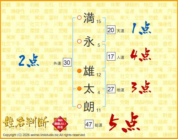 満(15画)永(5画) 雄(12画)太(4画)朗(11画)