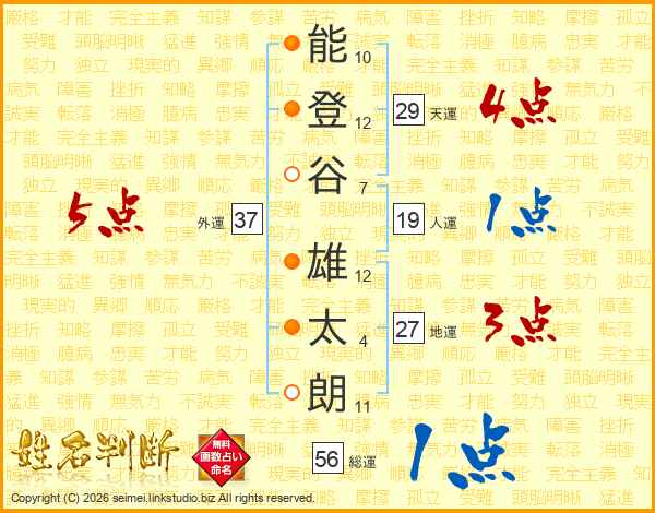 能(10画)登(12画)谷(7画) 雄(12画)太(4画)朗(11画)