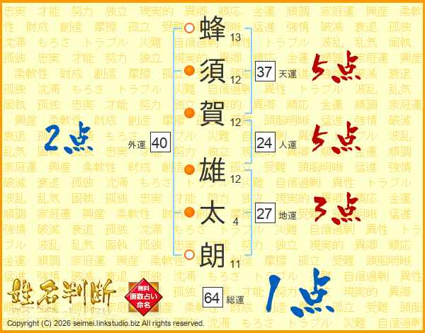 蜂(13画)須(12画)賀(12画) 雄(12画)太(4画)朗(11画)