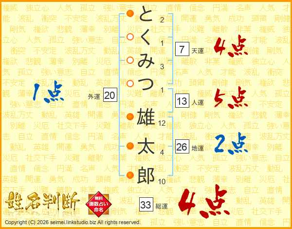 と(2画)く(1画)み(3画)つ(1画) 雄(12画)太(4画)郎(10画)