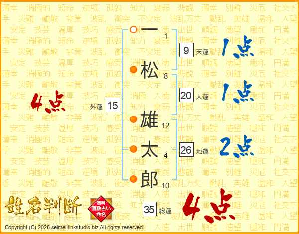 一(1画)松(8画) 雄(12画)太(4画)郎(10画)