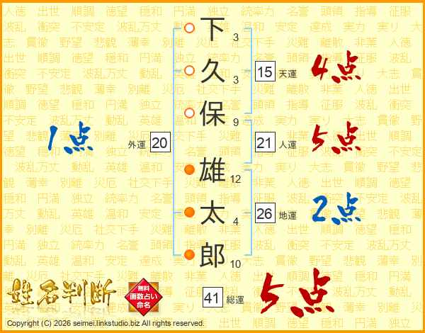 下(3画)久(3画)保(9画) 雄(12画)太(4画)郎(10画)